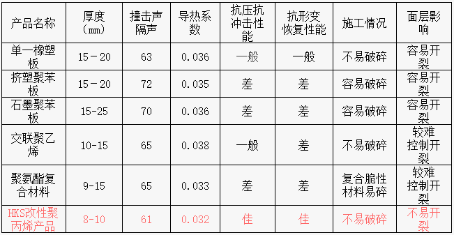 HKS改性聚丙烯保温隔声板与其他产品性能对比