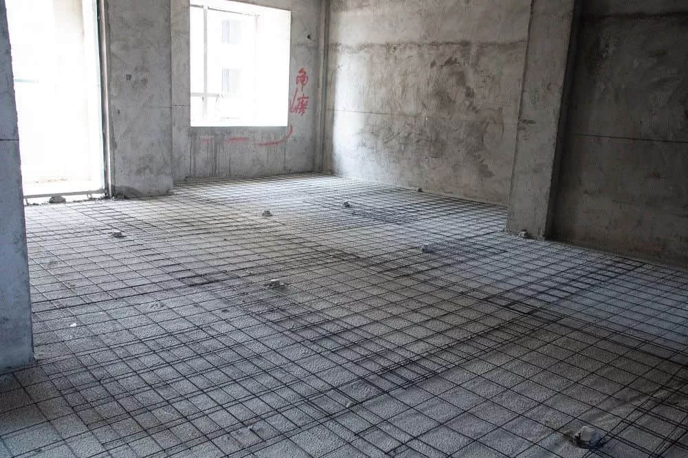 b.其次改性聚丙烯保温隔声板铺设完毕后开始浇筑混凝土(浇筑混凝土?;げ闶?,应及时修正钢筋网片的位置。墙角处、穿楼板管道处浇筑混凝土时,不得将混凝土浇入竖向隔离片和墙体之间。),混凝土?;げ阒胁坑ε渲酶纸钔?钢筋网片应洁净、无损伤,可在钢钢筋网片下面垫上垫块,确保钢筋网片置于混凝土保护层的中间位置,钢筋绑扎时,应避免铁丝头刺破HKS改性聚丙烯保温隔声板和防水胶带)。