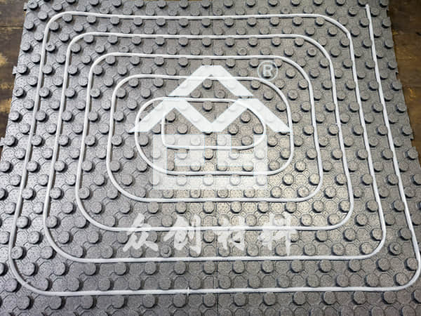 (3)施工简单,地面找平后,直接铺上地暖??椋懿凵杓朴氲嘏芡饩断嗤?,管槽卡管,节省人工,提高施工效率。